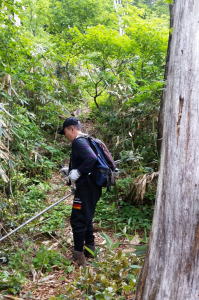 A班 今井さんは金沢山友会所属で、今秋みくまりの道周回を会山行企画として取り上げ入る予定と聞き、下見がてらの整備作業体験に誘った。