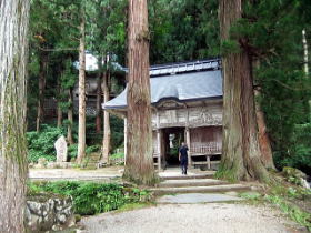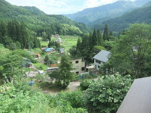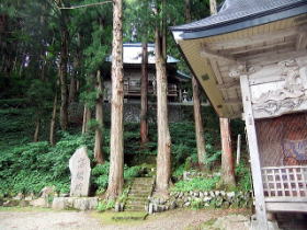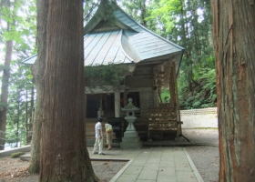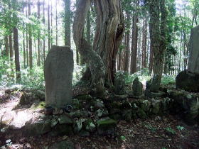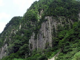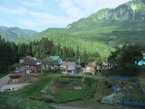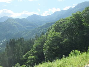 | 川を渡り対岸の屋敷集落へゆく。集落の上の展望のよい空き地から苗場山を眺める。 背後の布岩の柱状節理の岩壁が迫る。集落を散策、洗濯物を竿にかけている爺様に話を聞く。 ここは戸数35、うち30軒は山田性、あなたもそうかと問うと自分は山本、津南から来たという。 秋山郷発祥の地大秋山集落跡を訪ねる。天明の飢饉で食物がなく8軒の住人はすべて餓死したとある。 平家の落人伝説を偲ばすゆかりの品も食糧に替えたらしい。 牧之が訪ねたころは一望茅原でキリギリスが草鞋のふみ場所もないくらい飛び、その鳴声は平家の落人の魂かと思ったとある。 今は戦後あたりから盛んに植林された杉が育ち木陰のわずかな空き地に案内板があり石碑や墓がうずくまっている。 屋敷の村人が道の草刈りや法要を営んでいる。 |