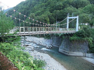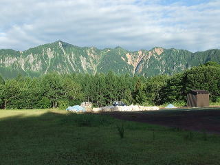 | 秋山郷の入り口、家2軒の清水川原を通り猿飛橋を左岸へ渡り坂道を登り結東、前倉を過ぎて渓谷に架かる前倉橋を右岸へ渡り大赤沢へ出る。 ここの集落は川床から離れ山際のゆるやかな傾斜地につくられている。 上野原のキャンプ場は子供たちで満杯。 栃の原温泉に向かいひだまり温泉ヒュッテの管理人に使用料を払い林間のサイトにテントを張る。 向かいの鳥甲山が荒々しく屏風のように山並みが連なる。宿のおばさんは群馬県の出身と聞く。 ヒュッテの前のブナの木に3匹の子犬が繋がれてじゃれあっている。 同行のOさんは最近愛犬を亡くしたばかり、かわいい子犬を見て心を動かされているが年齢のことを考えてもう飼えないよと子犬たちに言い聞かせる。 |