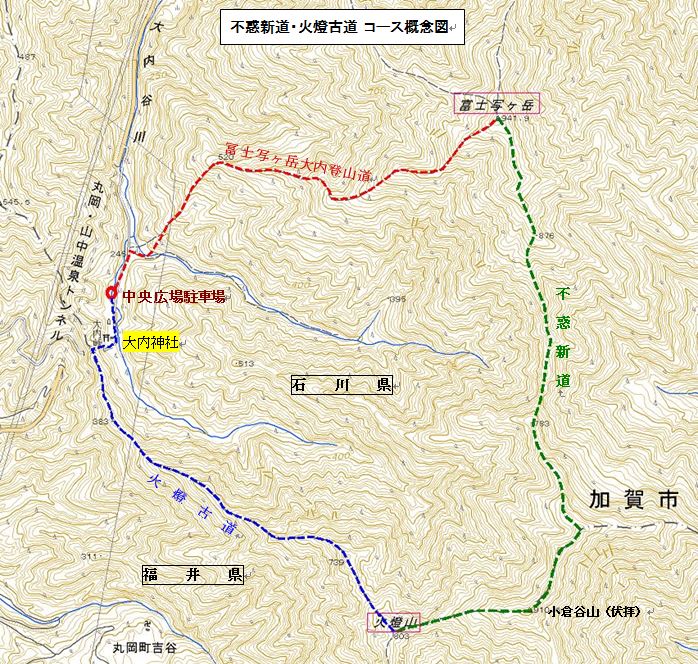 不惑新道及び火燈古道6.1kmは、石川支部が、公益事業・ふるさと登山道整備として取り組み、石川、福井両県の郷土の山を愛する仲間の協力も得て開いたもので、このルートは、随所にシャクナゲの群生を間近に見ることができ、春、秋のブナ林が美しい。白山、加越国境の山々や平野部の展望もよく、アップダウンや多少の急坂があって変化に富み、充実した山歩きができる。